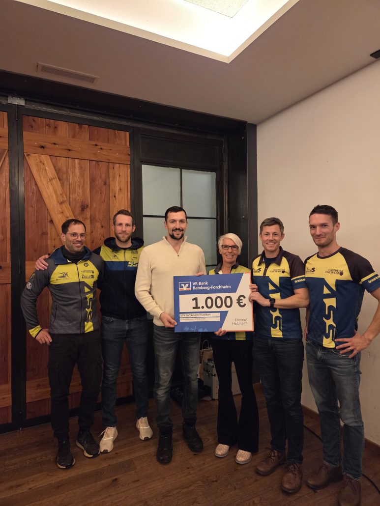 Ein besonderer Moment war die Spendenübergabe durch das Unternehmen Fahrrad Heilmann. Die Unterstützung richtet sich speziell an das Bayernliga-Herrenteam, das sich in der Saison 2025 erfolgreich im vorderen Mittelfeld behauptete. „Wir möchten den regionalen Sport stärken – und das Forchheimer Triathlonteam zeigt seit Jahren, wie viel Leidenschaft, Teamgeist und Engagement in dieser Abteilung steckt. Deshalb unterstützen wir das Herrenteam wieder sehr gerne mit einer Spende von 1.000 Euro“, erklärte Inhaber Manuel Heilmann bei der Übergabe.